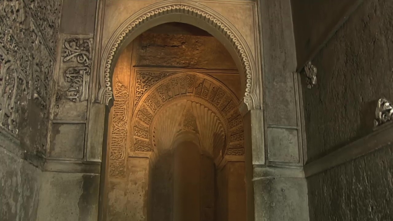 An inscription calls to prayer. It comes from the 7th Sura of the Koran. The Mihrab shows the faithful the direction of Mecca. Many prayer niches such as this one can be found throughout the palaces – everything that took place at the court was related to God.