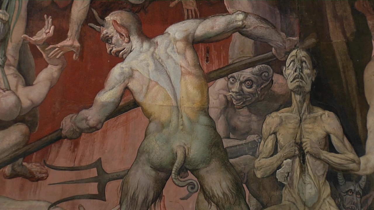 Over a surface area of almost 4 thousand square metres, it does take up the subject of the images in the baptistery: the Last Judgement. The focal point is again Christ standing in judgement over the world, surrounded by angels. In the past, a sculpture of the body of Christ lay in the centre of the altar. This made the message of Christianity crystal clear: when the faithful raised their gaze from the dead Christ up towards the heavens, they beheld the resurrected saviour in all his glory. The graphic images at his feet bring home to them what they can expect in the future: the promise of paradise, or the horrors of hell.