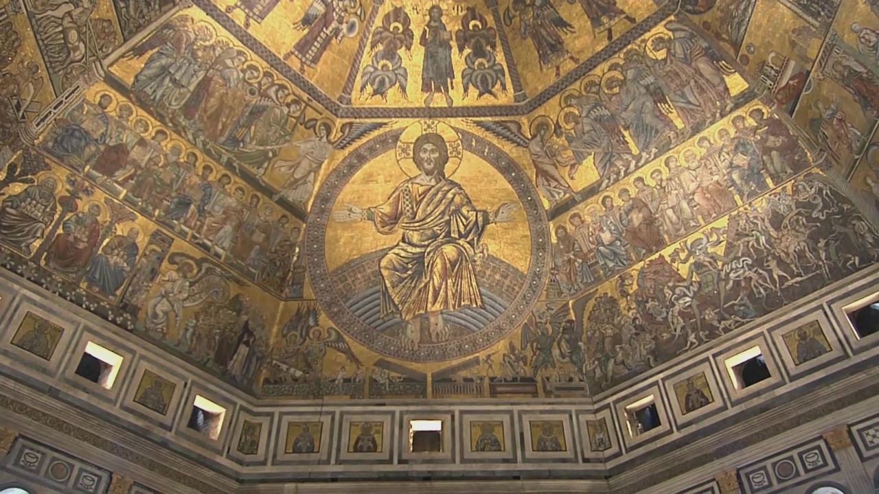 In the mid-11th century, Florence went through of a major economic and political boom. In the year 1059 the Florentines also began enlarging their baptistery. It became the city’s pride and joy – the great poet Dante named it “mio bel San Giovanni”, or “my beautiful Saint John”. With a diameter of 26 metres, the cupola was the largest in medieaval Europe. The magnificent mosaics also testify to the city’s wealth at the time. In keeping with the tradition of Byzantine icons, they are set against a background of pure gold – a symbol of the glory of God. They display the entire history of the world in 59 tableaux, beginning with the creation. In the second row, they relate the story of Joseph, one of the progenitors of the chosen people of Israel. Scenes from the life of Jesus follow. The lowest row of mosaics shows the story of John the Baptist. He baptised Jesus, and the baptistery has thus been dedicated to him.