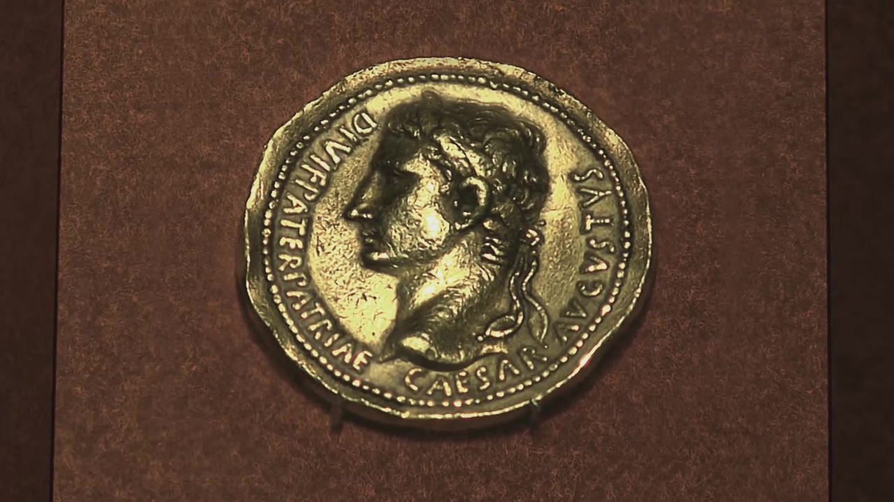 This most famous coin, a unique gold piece, was produced in the mint in Lugdunum – modern-day Lyon in France. The front shows the first emperor, Gaius Octavius Thurinus, adopted son of Julius Caeser, whose name he assumed, later known by the honorific ‘Augustus’ – the revered one. The inscription enumerates his titles: Caesar Augustus Divi Filius Pater Patriae – Caesar, the revered one, son of god, father of the fatherland. The so-called “Augustus medallion” was issued in the years 9 or 8 BC – and discovered in Pompeii in 1759.
