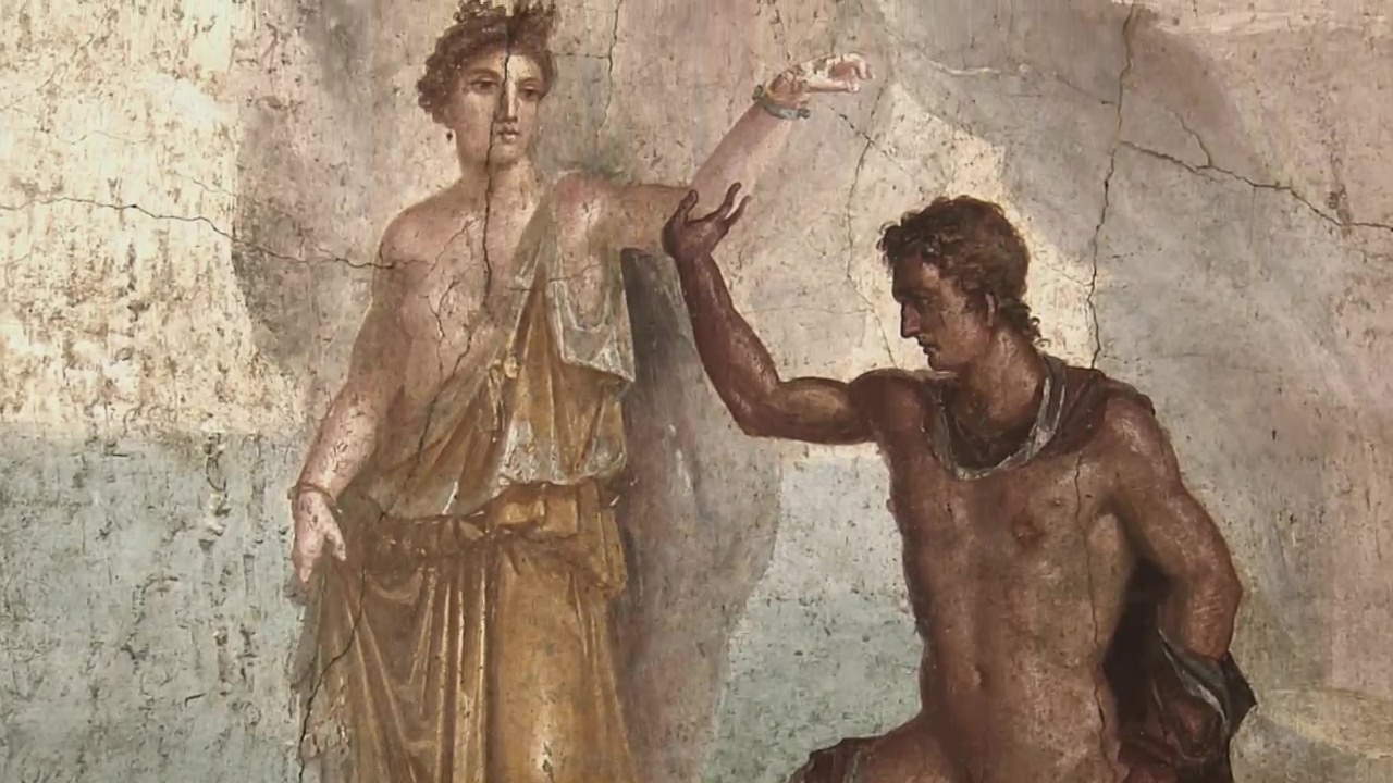 Around 40 AD the fashion shifted again. In Pompeii’s last decades the decorations became more individual. Mau’s Fourth, or Intricate Style had numerous different wall types – from solid monochrome backgrounds to staggered arrays of columns and windows. The architectural details were less central – and the shapes became increasingly fanciful. In the final century before Pompeii’s downfall, Greco-Roman myths were popular themes in wall pictures. Many of the frescoes tell the ancient stories of gods and heroes. One of the most popular was the tale of Perseus and Andromeda.