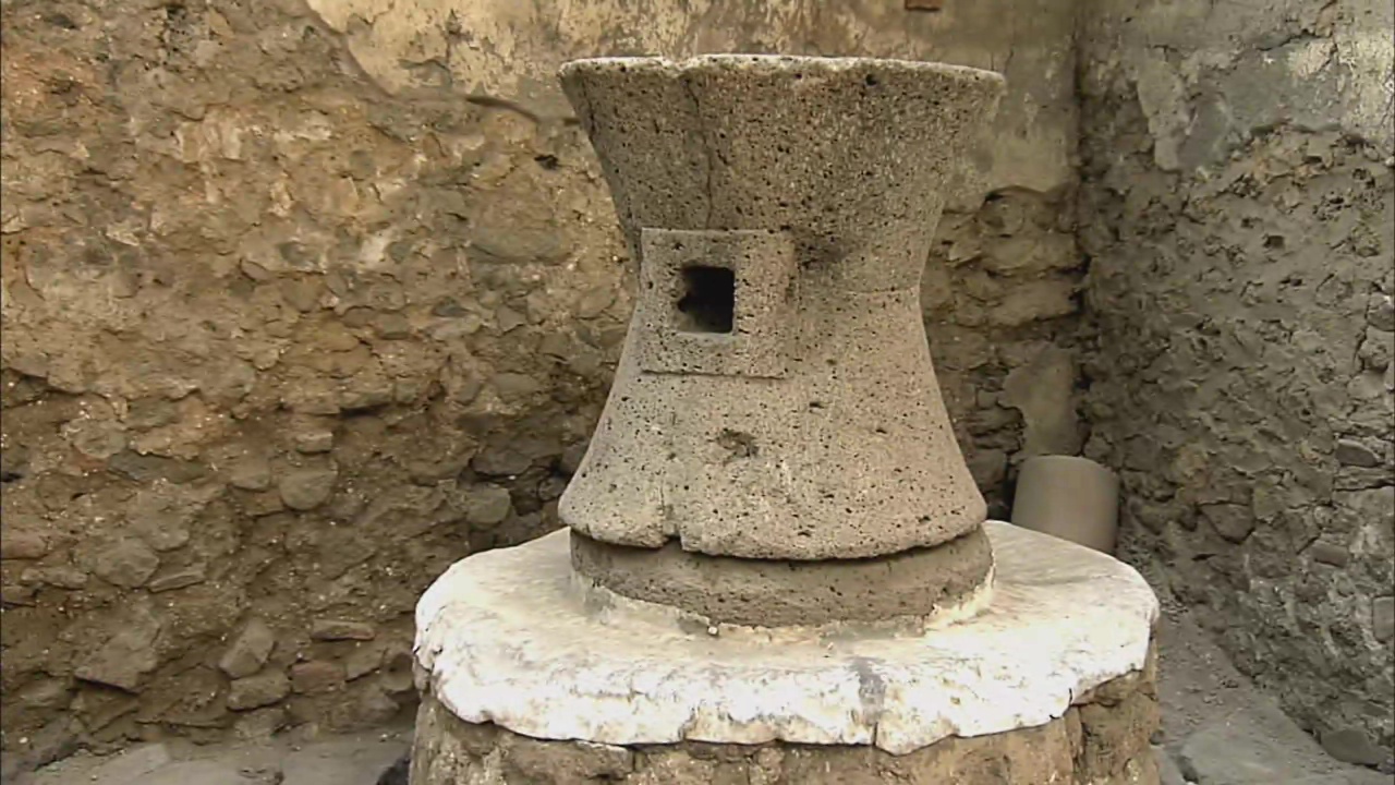 More than 50 professions have been identified in Pompeii, ranging from weavers to barbers, from painters to ”Public Pig Keeper“. Among the most important tradesmen are the bakers. Pompeii has more than three dozen bakeries. This is where the flour is freshly ground. The mills are turned by donkeys or mules. A side room off the bakery is the stall for these four-legged Pompeians. The heart of the bakery is the oven. More than a thousand years later this kind of wood-burning oven will produce the first pizza.