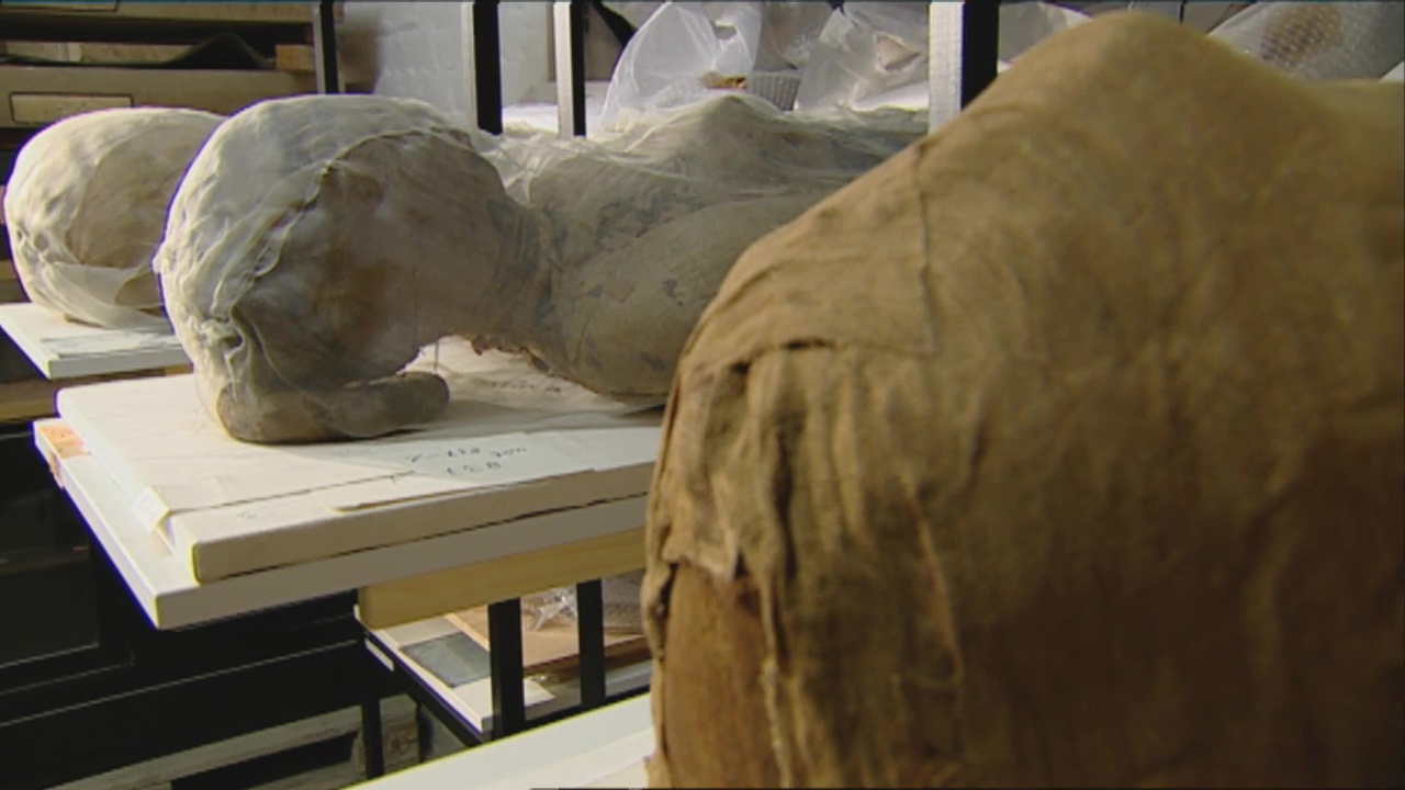 The same strict guidelines for storage conditions apply to the mummies as to the other objects made from organic materials. Here, in the wood storerooms, the temperature is strictly controlled. It’s only thanks to the constant temperatures in the hermetically sealed tombs that the wood and other organic materials have survived down the centuries.