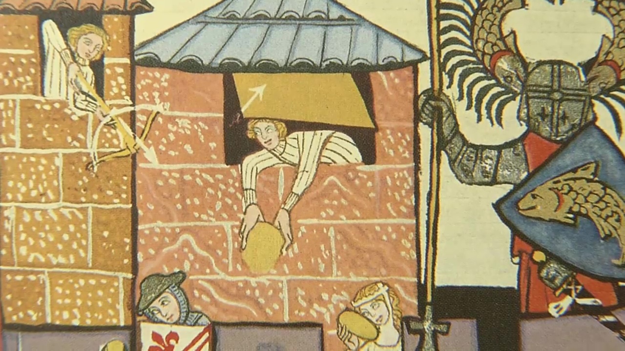 Back then, the knights fought each other with swords and lances to see who was more powerful. Like you see here – these are very old pictures, done during the Middle Ages. If a knight lost a battle, he could always flee back to the castle. That’s why the first thing they needed up on the mountain were high, strong walls.